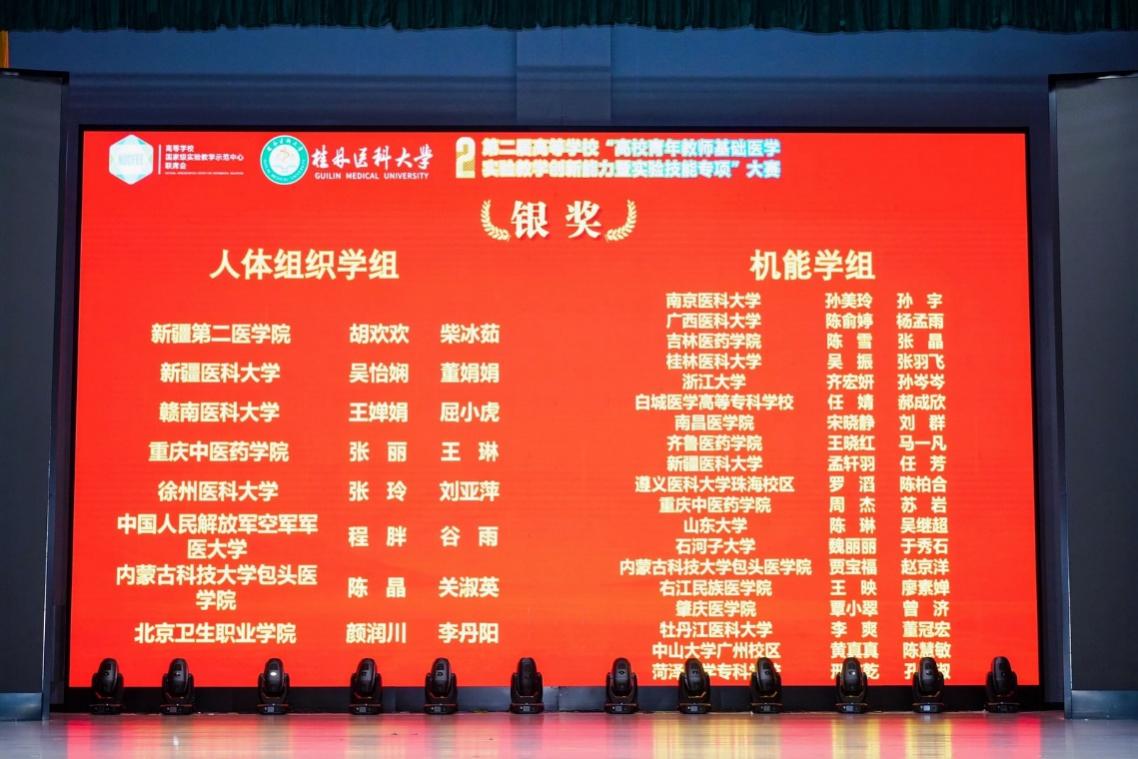 近日,第二届高等学校“高校青年教师基础医学实验教学创新能力暨实验技能专项”大赛在桂林医科大学举行。诸侯快讯基础医学院教师周杰、苏岩在该项比赛中荣获“机能学组(本科院校组)”银奖,张丽、王琳荣获“人体组织学组(本科院校组)”银奖,充分展现了学院基础医学教育教学的显著成效。