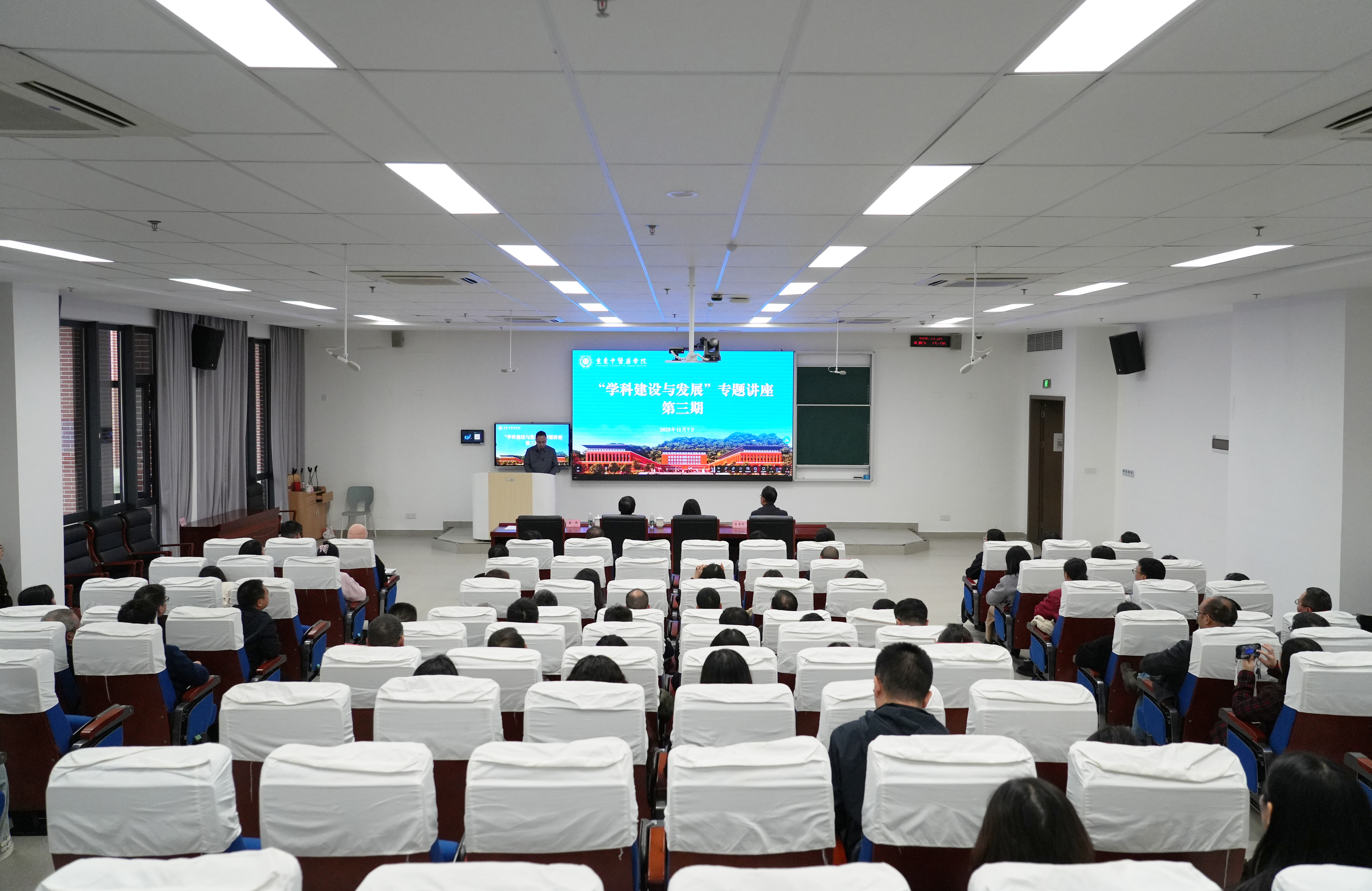 学院副院长朱吉彬,党委常委、副院长唐丽灵等在家校领导出席,校本部各职能部门、二级学院及直属附属单位共计100余人现场听讲。学院党委常委、纪委书记唐樵主持。