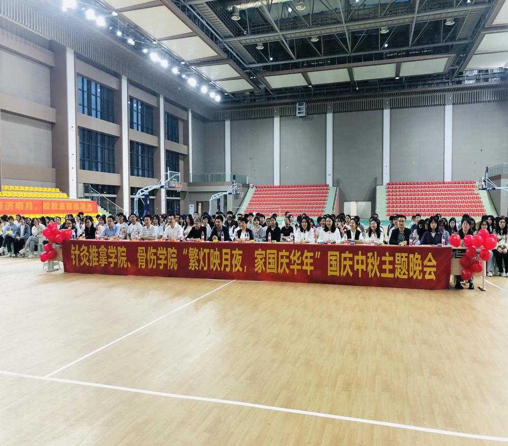 月是中秋明,情是中秋浓。适逢中秋、国庆双节来临之际,为庆祝中华人民共和国成立74周年,培养大学新生以爱国主义为核心的民族精神,打造温馨又充满活力的校园氛围,针灸推拿学院、骨伤学院全体师生于9月26日晚在校体育馆举行了“繁灯映月夜,家国庆华年”迎中秋、庆国庆联欢晚会。